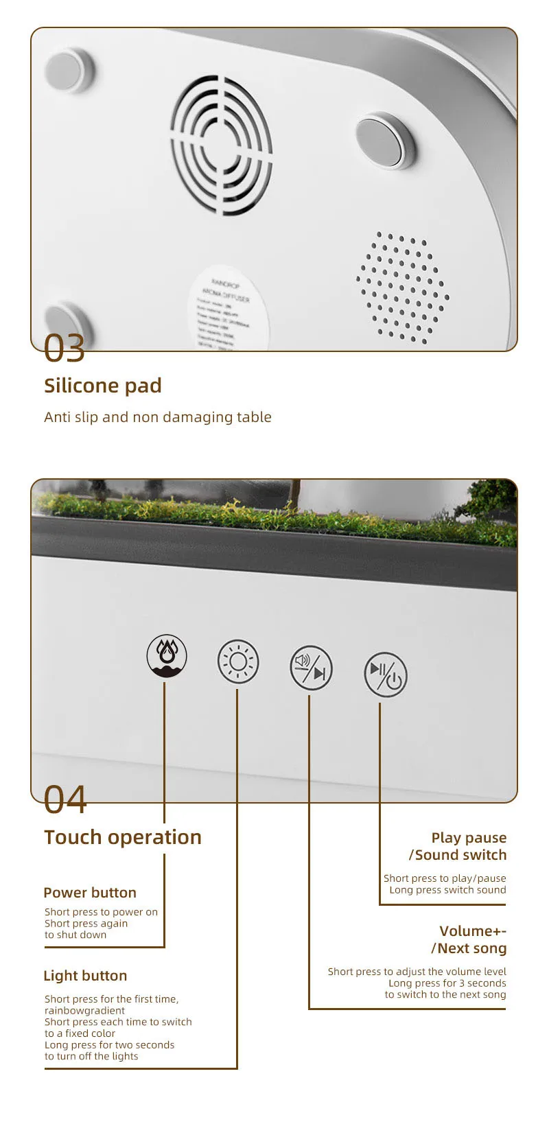 7.【Humidity Regulation And Aroma Diffusion Combined】It regulates humidity effectively and the aroma diffusion can eliminate odors, so you can breathe fresh air and enjoy a comfortable environment at any time. In a beautifully packaged box are included:1 x cloud & rain aroma diffuser, which brings you a comfortable experience; 1 x special charger, which ensures the continuous operation of the device; 1 x instruction manual, which helps you operate the device easily.