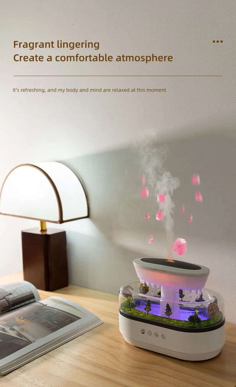 1.【Multi-Function Device To Relax Body And Mind】This Cloud & Rain Essential Oil Diffuser for essential oils is a 4-in-1 product that combines humidification, aroma diffusion, night light and ambient light. The aroma diffuser also features a carefully designed mini landscape. Delicate trees and a gentle water feature, surrounded by soft LED lighting, create a seductive atmosphere and instantly transport you to a tranquil natural environment.